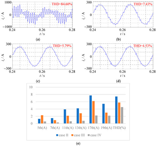 The filtered grid current performance in different cases with a capacitive load: (a) case I, full harmonic compensation; (b) case II, selective harmonic compensation; (c) case III, combining selective harmonic compensation and resonance damping strategies; (d) case IV, the proposed compound control; (e) comparison of grid current harmonic in three cases.