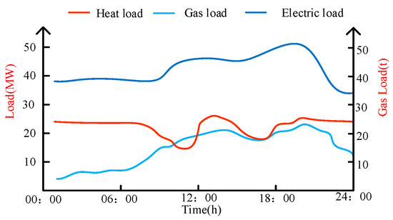 - The integrated energy system is connected to the external power grid and gas grid. The thermal system is not connected to the outside world. The predicted values of the electricity, gas, and thermal load of the system are shown in Figure 2—the forecasting curve of the electric thermal load of the integrated energy system.