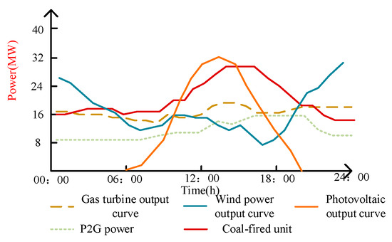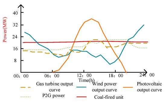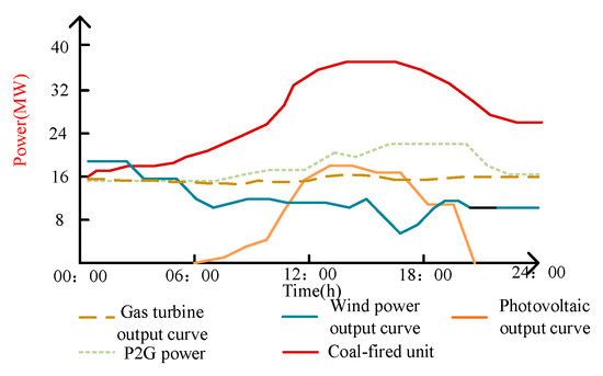 Figure 4, Figure 5 and Figure 6 and show the scheduling results in the three scenarios. It can be seen that during the period 11:00–19:00, the demand for electricity and gas peaks. However, the output of the coal-fired units in Scenario 1 is much larger than that in Scenarios 2 and 3. This is because after considering carbon trading, the operating costs of the units with a high carbon emission intensity (such as coal-fired power plants) increase significantly, while the operating costs of units with a low carbon emission intensity (such as wind turbines and gas-fired units) are relatively reduced. When the operating cost of high energy-consuming units continues to increase, it affects its power generation revenue; thus, in order to ensure the lowest operating cost of the system, the system dispatcher will increase the output by controlling the low-carbon emission units. Therefore, during this period, wind and photovoltaics are used first to meet the needs of users, then gas turbines are used, and coal-fired units are finally considered. To sum up, the carbon-trading mechanism promotes the consumption of clean energy in the integrated energy system and effectively reduces the carbon emissions of the system.