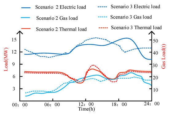The electrical, gas, and thermal response loads in Scenarios 2 and 3 are shown in Figure 7.