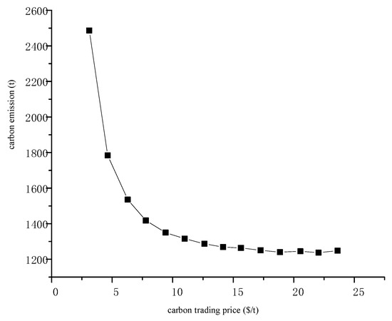 The carbon-trading price is the weight of the objective function, so the change in the carbon-trading price will affect the carbon emission and carbon-trading cost, and then affect the total operating cost of the system. In order to study the impact of carbon-trading price on system operation, the relationship between actual carbon emissions and carbon-trading price was analyzed and drawn.
