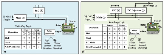 During this transition period, the pulses to the rotor converters are controlled to match the machine parameters such as voltage amplitude, frequency, and phase angle of stator terminals with grid parameters for synchronization. Once the machine is synchronized with the grid, the vector control strategy is adopted in MSC “Position B—closed-loop vector control”. The operational sequence of the proposed energy-efficient dc injection start-up strategy is shown in Figure 2b. Stator winding connections are switched using circuit breakers during the starting process, whereas the switching of scalar control mode and vector control mode is carried out through a soft-switching mode. The steps involved in the energy-efficient dc injection start-up strategy of the DFAM are given below.