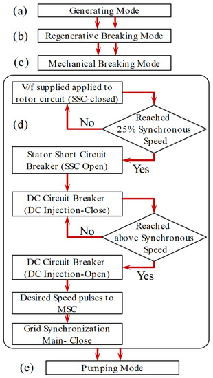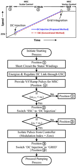 - Step 1: The stator circuit of the machine is shorted (the main circuit breaker is opened, and SSC is closed), and the rotor is energized with V/f control by machine side converters (MSC). During smooth starting, starting current should not exceed the acceptable limit and maintain a constant torque. The flowchart in Figure 10 indicates the starting sequences.