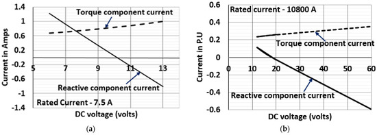 The technique provided in this paper creates the required magnetic flux by d-axis stator current from the DC supply. The magnitude of the DC voltage is estimated based on the requirement of reactive component current during starting (no-load) and also no-load torque is considered. The estimation of reactive component current () is calculated from the rotor current of the machine by Clarke and Park transformations. The DC voltage connected to the stator circuit is estimated by , . Alternatively, the DC voltage can be estimated based on stabilization characteristics of the 2.2 kW DFAM test machine and 250 MW DFAM, as shown in Figure 5a,b, respectively. The stabilization characteristics are plotted between DC injection voltage and reactive current components. The selected DC voltage value (in case 250 MW DFAM, 2500/25 V, 4000 A) is injected to DFAM through rotor slip rings from a low voltage DC source to reduce the slip losses and provide the required reactive power for the start-up.