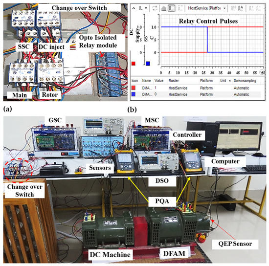 The following alterations to the machine were made to execute the intended research. The manual spring balance dial and the frames are removed, a load-cell arrangement is built for torque measurement. Similarly for speed measurement, the tacho-generator is replaced with a quadrature encoder pulse (QEP) sensor. A quadrature encoder pulse (QEP—Avago HEDS 5645-113) sensor is connected to the shaft for providing the pulses to the controller (512 pulses/revolution) with respect to speed and position. To control the voltage source converter and changeover switch, a real-time controller (TMS320F240 DSP) interfaced with Matlab/Simulink software is used. The Optocoupler circuit is used to isolate and intensify all the signals from the controller. To sense the voltage and current signals, Hall Effect voltage and current sensors (LV-25 P & LTS 25 NP) with an active filtering circuit are employed in the circuit. Also, the changeover switching unit consists of three 3-pole contactors with an auxiliary switch (L&T MNX 32 and MNX A1) for switching the stator windings between SSC, DC injection, and main grid supply. An additional breaker is also employed to alternately isolate or connect the rotor windings from MSC. All the breakers are controlled through optoisolated relay units (SRD-5V-SL-C, 10A). The electrical input quantities of rotor and stator are measured and recorded through three-phase power quality analyzers (PQA—Fluke 435) and dSPACE control desk 3.7.3 automation. The recorded results are analyzed using Fluke view and Power log software. A snapshot of the experimental arrangement is depicted in Figure 6. The rating of the test machine is tabularized in Table A1 (Appendix A).