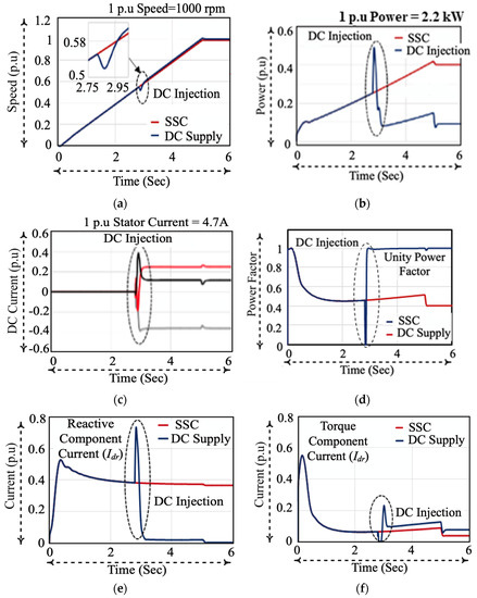 - Step 2: Stator windings terminals are switched from SSC to the DC supply once the machine attains 25 percent of its rated speed, and is continued up to rated speed (approximately at 70 s from starting). Once DC supply is injected, the reactive power producing current reduces to a minimum value (0.009) p.u. whereas, the torque producing current remains the same. The slip of the machine becomes zero during DC injection which eliminates the slip losses. These factors reduce the overall energy consumption of machines during start-up.