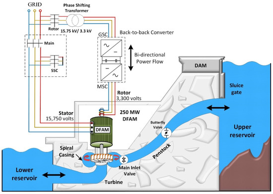 Initially, the PSPP was employed with the fixed speed in the early decades of the 20th century, where synchronous generators were started in pumping mode with the help of pony motors [3]. The fixed speed PSPP employing synchronous machines has disadvantages in terms of system efficiency, which is impacted because of: (i) change in water head level throughout the year in dam, (ii) change in excess power availability in the grid for pumping mode, and (iii) change in power generation according to grid demand for generating mode. The advancement of hydroelectric PSPP laid the path for developing a Variable Speed Pumped Storage Power Plant (VSPSPP) wherein the speed of the turbine is adjusted by the water head to yield maximum efficiency and a variable speed generator is used [4]. In 1993, Japan-based Hitachi Mitsubishi Hydro Corporation started to commission the first large-rated VSPSPP of 400 MW with the help of a cycloconverter to meet slip power requirements (±8.3%) [5,6]. In this application, a Doubly Fed Asynchronous Machine (DFAM) is used. In the pumping mode, starting of the pump-turbine is carried out by an additional static frequency converter due to the limitation of cycloconverter operation (below 16.66 Hz). (The DFAM is sometimes called a Doubly-Fed Induction Generator, or DFIG, when the asynchronous (induction) machine is used as a generator).