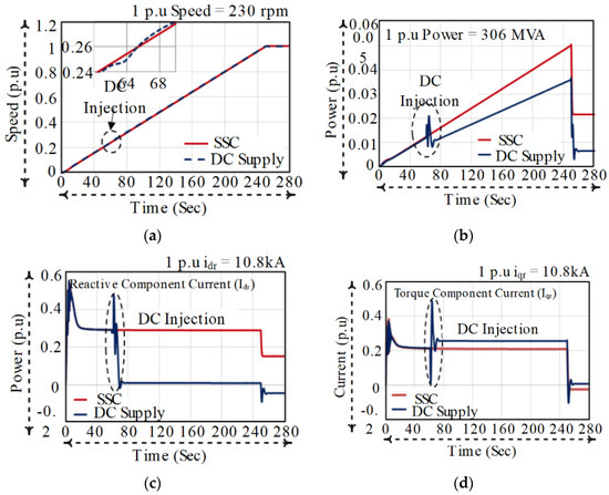 The duration for smooth starting is selected as 250 s for starting, and boost voltage and frequency ratio are selected as 430 volts and 7 Hz respectively. The fixed DC voltage is selected as 16.8 volts by considering the reactive current component and dc source voltage characteristics (see Figure 5b). The rotor speed at which the changeover switch is operated from stator short-circuited to DC supply is 27% of the synchronous speed. The converter voltage rating is selected by the minimum voltage required during starting of the machine. In the proposed method, the machine rotates at synchronous speed after injecting DC supply to the stator circuit. Thus, the slip losses are zero when the machine operates at synchronous speed. Meanwhile, the speed of the machine is increased due to the elimination of slip with a slight oscillation. Since the DFAM is started with no-load, this oscillation should not affect the system’s performance. Likewise, during start-up with SSC, the rotor line voltage ramps from 990 to 3300 volts and consumes power up to 15.48 MVA (max), which includes 9.8 MW of active power and 11.95 MVAR of reactive power, whereas the proposed strategy consumes up to 11.38 MVA (max), shown in Figure 11b. Once after stablization, the power consumption is reduced to 6.67 MVA and 2.08 MVA for the conventional SSC and the proposed DC injection stragey respectively. In the conventional method, the machine consumes about 0.2896 p.u (3128 A) of reactive component current for magnetization and 0.210 p.u (2268 A) of torque component current for acceleration. Whereas, both reactive and torque component current produces transients of about 0.4742 p.u (5121 A) and when the reactive component current approaches zero, the torque component rises to 0.2554 p.u (2748 A) during DC injection, as shown in Figure 11c,d.
