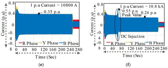 During the short circuit condition on the stator side, Phase A carries 0.308 p.u (3465 A), phase B carries −0.02 p.u (225 A) and phase C carries −0.284 p.u (−3195 A) currents, shown in Figure 11e. Also, it is observed that the maximum transient current (phase A) produces at the stator circuit when DC is injected to stator winding is 0.55 p.u (6188 A), shown in Figure 11f. The simulation results show that the rotor and stator current of the DFAM during the transition period (SSC to DC injection) is below the rated value (10,800 A) and it should not produce any harmful effect on the machine.