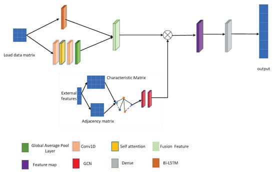The main features used for load forecasting include historical load data, economic indicators of various industries in the whole society, weather (temperature, humidity, wind, and rainfall, etc.), and electricity price policies, etc. Due to the fact that people in different regions and industries have various power consumption modes, SLF is more challengable than MLF and LLF. The SLF approaches are now divided into two categories, which are the classical techniques and the machine learning methods. The first category includes time series analysis [5], multiple linear regression [6], and Kalman filtering [7], etc. Although these models are easy to conduct, it is difficult to extract complex features of energy consumption patterns from them, and their robustness is poor. The other is the machine learning based methods, such as clustering [8], decision trees [9], random forests [10], support vector machines [11], fuzzy logic [12], and neural networks [13], etc. Owing to its superior feature extraction capabilities, deep learning has been one of the most appealing approaches for SLF in recent years. Recurrent Neural Networks (RNN) [14] are the most commonly used time series prediction models in deep learning, accomplishing series prediction by examining the temporal correlation between time series. Long Short Term Memory (LSTM) networks [15] are one of the most effective implementations of RNNs, solving the problem of long-term dependence of time series and are the most commonly used model in SLF. Convolutional Neural Networks (CNN) [16] are another popular deep learning model effective at extracting spatial data. One-Dimensional Convolutional Neural Networks (1D-CNN) [17] can identify basic patterns in time series data and collect local information, which can be used with RNN to boost prediction accuracy even further. One of the current hot issues in time series research is selecting and extracting distinct features and boosting the prediction potential of the model via feature fusion [18]. External characteristics such as geography, industry, economics, and weather may boost the feature richness and forecasting capabilities of the model in SLF. External features, on the other hand, are usually irregular, and CNN cannot handle the unstructured input and has limited capacity to extract irregular features. Thus, the Graph Convolutional Network (GCN) [19] was proposed. Not only can a GCN recover irregular features, but it can also capture the association between distinct characteristics.