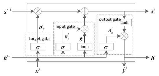 The LSTM network is a special kind of RNN that substitutes the RNN’s implicit function with a memory neuron, which can recall more information than an RNN alone and is appropriate for processing sequences with longer gaps or delays. Figure 2 [32] depicts the structure of the memory neuron structure in the LSTM network, which primarily consists of the forget gate, input gate, information update, and output gate, where denote the input and output information at moment t, respectively, which represents the state vector, which is utilized by the LSTM network to recall the history information; represents the candidate vector, which is used to update the state vector, sames as output message , and it is delivered to the next memory neuron as the activation vector. denote the forget gate, input gate, output gate, respectively; and are both activation operations, designates the sigmoid function, and denotes the hyperbolic tangent function, .