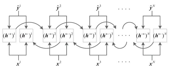 where denotes the activation function that incorporates the operations of Equations (1)–(4), denotes the activation function that performs weighted splicing on the outputs and of the forward and inverse LSTM networks, are the weight matrices and bias vectors for calculating the forward LSTM network’s output , respectively, and are the weight matrices and bias vectors for generating the forward LSTM network’s output , and is the output of the previous memory neuron in the inverse LSTM network’s output. is the output of the previous memory neuron in the forward LSTM network, which is set to 0 if the present memory neuron is the first, and is the output of the latter memory neuron in the reverse LSTM network, which is set to 0 if the present memory neuron is the last.