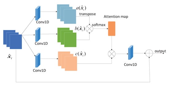 The AM improves the convolutional kernel’s perceptual field, while the SAM is a version [34] of the AM that lowers reliance on external input and is better at capturing the internal importance of data or features. The SAM is employed in this paper to improve the capture of target feature dependencies, and its implementation framework is presented in Figure 4.