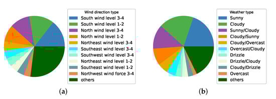 The data is derived from the Shandong Data Open Network, China - Grid Bus Load Dataset and includes monitoring data for various buses corresponding to 5-min sample intervals from 1 January 2019 to 2 March 2020, with around 20,000 data points for each bus. Furthermore, the weather data for distinct area IDs comprise a total of 142 data points for weather (e.g., sunny/cloudy), 78 data points for wind force, and wind direction (e.g., north wind force 1–2/north wind force 3–4), and 83 data points for substation and bus information. The number of buses used in these trials is 10, with a total data volume of roughly 200,000. Figure 5 depicts non-digital feature data such as wind force, wind direction, and weather.