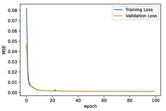 The first of monitoring data from each bus (a total of 140,000 data points) was utilized to create the training data set, and the final output was the projected outcome of the 60,000 individual monitoring data points selected for the test. Five identical experiments were averaged to improve experiment reliability. As indicated in Figure 6, the loss function was the Mean Square Error (MSE), MSE defined as follows: