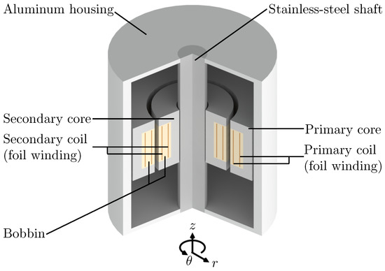Wireless power transfer (WPT) by means of an inductive coupling is a popular and mature technology. Correspondingly, inductive WPT systems are widely applied in applications that require reliable and durable power transfer to rotary parts, for example, robotics and battery charging applications [1,2], as well as electrical machines and actuators [3,4]. Such a system generally employs a cylindrical transformer, which consists of a stationary- and rotary side separated by a (small) air gap. For the purpose of achieving a high magnetic coupling, a magnetic core, which provides a low reluctance path to the magnetic flux, is often added on either or both sides of the system. Furthermore, a high electrical frequency is generally applied, which benefits the efficiency and reduces the volume [5]. Consequently, gallium-nitride (GaN) transistors are emerging in WPT applications, since frequencies in the range of several MHz are realized compactly and efficiently [6]. The electrical frequency of a WPT system based on an inductive coupling typically ranges from tens of kHz up to several MHz [7]. In order to accommodate for high electrical frequencies, the magnetic core material is generally ferrite, which, as a result of the low electrical conductivity, has low losses in a wide frequency range, i.e., up to 3 MHz for energy conversion applications. Furthermore, the coils typically consist of litz wire, such that the losses caused by the skin- and proximity-effect are minimized. Alternatively, foil windings are often applied in case the required effective copper cross-section is high [8]. In small transformers, foil windings are popular as a result of the simplicity of the winding operations [9].