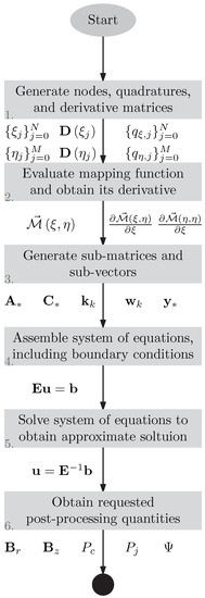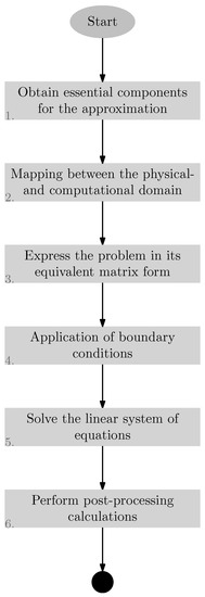 - An initialization step is performed, in which the nodes where the field variable is approximated are derived. Furthermore, the matrices required to compute integrals and derivatives are derived, which are essential components for the approximation of the governing equations. These aspects are further detailed in Section 2.3.1.