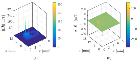 Magnitude of the magnetic flux density (a) obtained with the SEM. The difference with respect to the FEM solution is shown in (b).