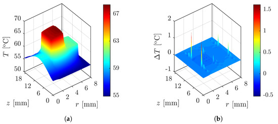The temperature distribution obtained with the SEM and the difference with respect to the FEM is shown in Figure 7. Similar to Figure 5, an accurate match between the methods is obtained and negligible differences due to Runge’s phenomenon are observed on the edges. Consequently, the average primary and secondary coil temperatures, the results of which are included in Table 2, are accurately calculated, a maximum discrepancy of 0.081% with respect to the FEM is observed.