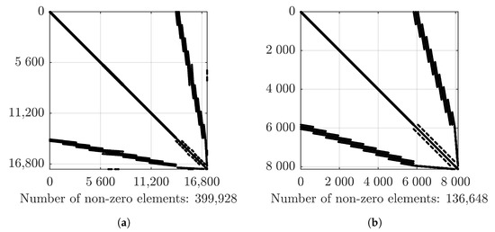 Sparsity patterns of the global matrices in the (a) electromagnetic and (b) thermal SEM model of the benchmark system.