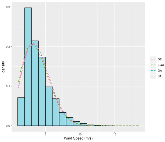 - Alrashidi, M.; Rahman, S.; Pipattanasomporn, M. Metaheuristic optimization algorithms to estimate statistical distribution parameters for characterizing wind speeds. Renew. Energy 2020, 149, 664–681. [Google Scholar] [CrossRef]