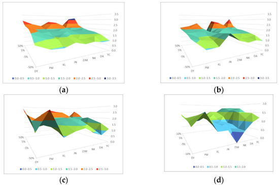 Figure 2 shows the changes in the performance evaluation value of eight sample coal-fired power enterprises when the weights of six indicators were floating. The surface change represents the influence of weight on the performance results. Among them, when the weight of each index changed, the organizational performance evaluation result of YC coal-fired power enterprise was always the best, and the sensitivity of six indicators was less than 0.8. This showed that the index with a larger weight had good stability, and it can be concluded that the other 14 indexes with relatively small weight have better stability. Therefore, it can be said that the evaluation result has stability.