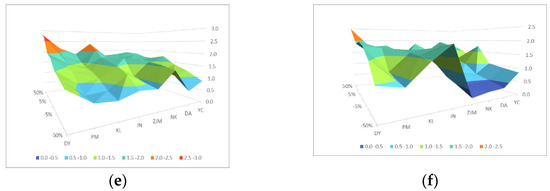 Sensitivity analysis result. (a) Q13 Sensitivity analysis result; (b) Q42 Sensitivity analysis result; (c) Q43 Sensitivity analysis result; (d) Q41 Sensitivity analysis result; (e) Q21 Sensitivity analysis result; (f) Q44 Sensitivity analysis result.