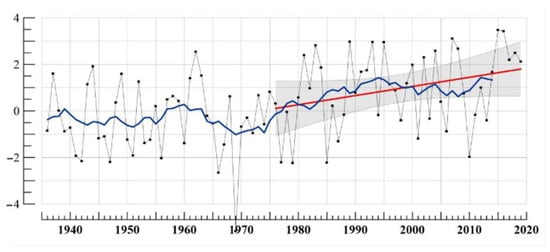 Extensive industrialization of the Russian North, mostly the oil and gas industry, required new methods of construction, and one of them was ensuring the stability of structures by keeping the ground base frozen. It began to be used worldwide once N. Tsytovich had developed necessary studies in 1928 [29]. The method included ventilated cellars under floors and was implemented in Yakutsk in 1937 [30] for the construction of a new power station, which is still operational. A large number of buildings and engineering structures were successfully constructed in the North and the Russian North-East (cities of Vorkuta, Norilsk, Yakutsk, with hundreds of thousands of civilians, etc.). Large oil and gas fields in Western Siberia were in operation and about 200,000 km of main pipelines were constructed. The construction was supported by a network of permafrost monitoring stations funded by the government. The network was functioning until about 1980 when it seemed that all problems with permafrost were basically solved; it seemed that the construction industry in the Russian North, and mostly all around the world, was completely supplied with technologies and materials. Accordingly, the permafrost stations were closed, and scientific studies were gradually reduced. At this time, everything was fine, because this period was also cold. However, climate warming began later, and more rapidly than on average in the Northern Hemisphere (Figure 2).