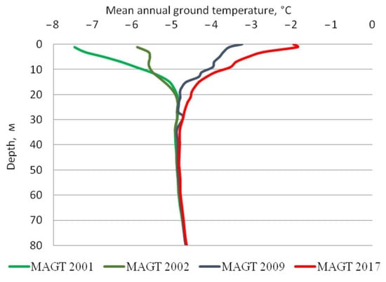 An increase in the mean annual air temperature (MAAT) and winter precipitation has led, in recent decades, to significant changes in the temperature mode of permafrost. Soil temperature in the upper layers for the last 30 years has increased by more than 1.5/2.5 °C in some arears of the Russian Arctic (Figure 3). In the tundra of the European territory of Russia, the permafrost temperature rose to −0.2/−1 °C. In the forest tundra and southern tundra of Western Siberia, at conditions of discontinuous and continuous permafrost, the temperature has increased by more than 1.5 °C over the past 20 years. In Eastern Siberia, the mean annual ground temperature (MAGT) in the Arctic zone during the monitoring increased by an average of 1.5/1.9 °C. Over the past 35–40 years, the background temperature values of the upper part of the permafrost in the coastal lowlands of Western Siberia have increased by 2.0 to 4.0 °C, depending on the geomorphological level. At the same time, an increase was recorded not only in the layer of zero annual amplitudes (10–15 m), but also significantly lower, in depths of 25–30 m.