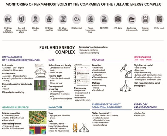 Various enterprises and organizations monitor the condition of buildings and engineering structures, including production wells, main pipelines and power plants. Geotechnical monitoring (GTM) usually includes measurements of soil temperatures and deformations of buildings and facilities only. GTM is most fully represented at the facilities of the gas industry, more so than in any other spheres of industry, including transport and municipal facilities. Larger companies have already implemented an extensive monitoring (Gazprom—over 12,000 temperature boreholes; Transneft—close to 7000; Novatek—more than 3500).