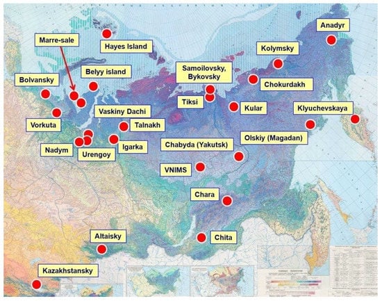 During the First International Geophysical Year (1882–1884), the St. Petersburg Academy of Sciences sent a group of researchers to the northern part of the Lena River delta to organize year-round observations. From 1951 to 1953, researchers from the Permafrost Institute studied permafrost conditions, including regime measurements of temperature and depth of soil thawing at the islands of the Yansky Bay, Yana, Lena and other rivers. The studies became a base for the design of the first hydropower stations on permafrost. The Permafrost Department of Lomonosov Moscow State University has been monitoring the Yenisei valley for more than 20 years, at the crossing point of the Messoyakha and Norilsk gas pipeline. A number of monitoring sites were functioning in the north of Western Siberia, where oil and gas fields have been discovered [27,28]. For that period, manual methods of measuring the radiation–thermal characteristics and physical properties of soils were used. Therefore, long-term observations could be organized at permafrost stations, for instance in Igarka, Yakutsk, etc. Permafrost stations outside large settlements worked for a short time (1–3 years), since it was expensive to keep staff in remote areas all year round.