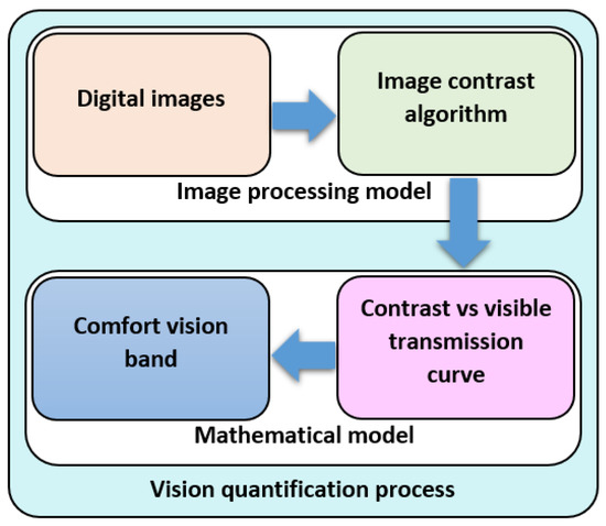 Human visual perception is based on the contrast of images [27,28,29]. The contrast property enables human eyes to distinguish between two adjacent objects in an image [30,31]. Therefore, quantifying vision through glazing can be achieved using an artificial vision system to derive the real-time contrast value, which reflects the quality of human vision.