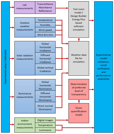 The experimental indoor measurements involve the temperature and illuminance level inside the test room, which are used to evaluate the performance and validate the system. Additionally, digital images are captured from inside the test room towards the external environment through the window. These images are applied to the proposed vision quantification model to determine the comfort vision band in real time. The outdoor measurements were employed to prepare the weather data file of the commercial DESIGN BUILDER software. DESIGN BUILDER software was used to derive the energy model. The weather and optical data were applied to the model to achieve the simulation. The simulated and experimental data, in addition to the outcome of the quantification process, were used to validate the experimental model, verify the experimental result, and evaluate the system performance.