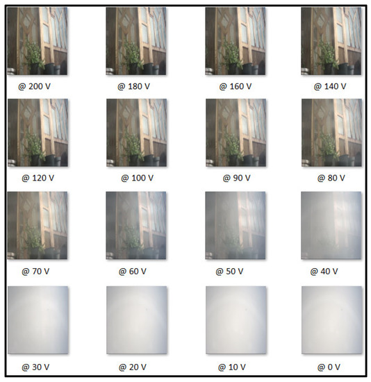The images in Figure 3 were captured in an external environment during daytime on a sunny day through a double-glazed PDLC window with different visible transparencies. Each image was taken after setting the applied AC voltage of the PDLC within the rated voltage (0 to 200 V), as shown in the figure.