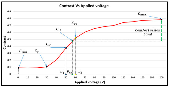 The vision is considered to be comfortable if the contrast is above approximately 0.48; this value is the threshold value of the contrast, and was calculated graphically from the contrast–voltage curve. However, this point does not correspond to a fixed transparency and voltage in all cases. The threshold contrast point () represents a proposed minimum comfort band that limits the transparency. In Figure 4, the threshold contrast value lies between two given points, ( and (; hence, the threshold contrast value can be expressed mathematically as below: