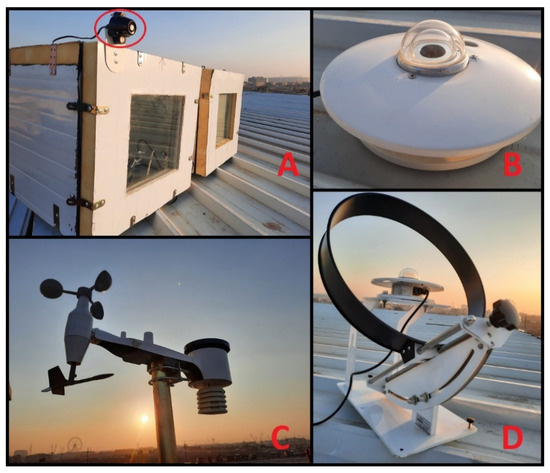 Experimental setup. (A): Reference room with double-glazed window (closer), PDLC room (further), and the pyranometer for vertical global irradiance measurement (circled). (B): Pyranometer for global horizontal irradiance measurement. (C): The weather station. (D): Pyranometer for diffuse horizontal irradiance measurement.