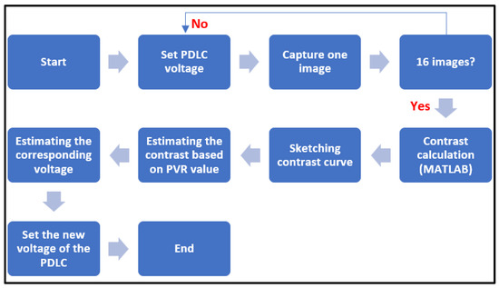 The experiment was executed from 5:30 AM to 6:30 PM. The process shown in Figure 6 was run 27 times daily (every 30 min) on the second room. The process required 2 min to be executed manually each time. The algorithm started by setting the PDLC film voltage to a specific value from among 16 values in the range 0 to 200 V. One image was taken each time for each voltage value. MATLAB then obtained the voltage versus contrast relation and the threshold value .