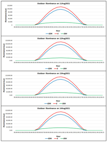 According to the IESNA approach mentioned in Equations (2)–(7), the illuminance data were calculated for 11 to 14 August 2021, as shown in Figure 8, including direct normal illuminance , diffuse horizontal illuminance , and the total illuminance . The effective daylight period was from 5:00 am and 7:00 pm; however, the calculation showed that the available estimated illuminance during the four days was approximately equal. There are two reasons for this: first, since the days of the experiment were consecutive, the sun elevation angle was almost the same; second, because the four days had the same sky clearness parameters (sunny days).