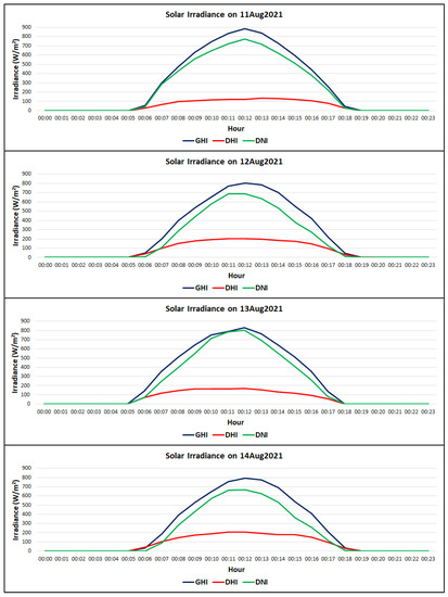 The solar irradiance data during the four days are shown in Figure 9, including global horizontal irradiance and diffuse horizontal irradiance ; solar radiation slightly varied from 11 to 14 August 2021.