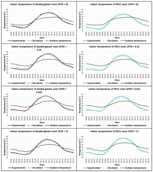 The indoor and outdoor temperatures of the test rooms are plotted against the days of the experiment in Figure 10. During the first day, when the PVR was adjusted to 0, which corresponds to the minimum available contrast in the comfort vision band, the experimental and simulated indoor temperatures responded to the variation in the outdoor temperature with good correlation. The maximum recorded temperature inside the reference model at 2:00 p.m. was 58.8 °C, and the average temperature was 41 °C, whereas the highest and average temperatures for the PDLC model were 56 and 38 °C, respectively. The average deviations between the experimental and simulated temperatures inside the double-glazed window room and the PDLC room were 0.12 and 0.37 °C, respectively.