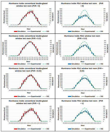 Starting with day 1 and a PVR of 0, the experimental and simulated indoor illuminance values respond to the variation in the outdoor vertical global irradiance with good correlation. The maximum recorded illuminance inside the reference model at 12:00 pm (at the highest value of ) was 4.1 Klux, and the average illuminance was 2.6 Klux, whereas the highest and average illuminance values for the PDLC model were 3 and 1.9 Klux, respectively. Similar trends can be observed for other PVR settings on other days.