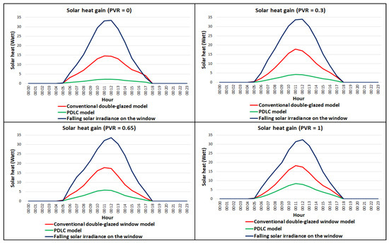 Clearly, raising the preferred vision ratio resulted in an increase in a heat gain inside the PDLC test room; for instance, with a PVR of 0, the average heat gain inside the PDLC test room was only 16.6% of that in the reference room; this percentage was 25.1% with a PVR of 0.3, 34.7% with a PVR of 0.65, and 47.1% with a PVR of 1. Moreover, the solar heat gain coefficients computed by the DESIGN BUILDER software were 0.42, 0.49, 0.56, and 0.78 based on PVRs of 0, 0.3, 0.65, and 1, respectively.