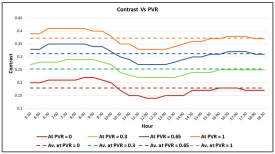 Modifying the PVR has a direct impact on the quality of vision through the PDLC window, as elucidated earlier, since it determines the operating point on the comfort vision band of the contrast–voltage curve, which represents the contrast value of the instantaneous external scene seen through the window. Consequently, the visible transparency was estimated accordingly. Figure 13 depicts the contrast values during daytime, which were determined by the proposed algorithm during the days of the experiment. Obviously, choosing a higher PVR prompts the system to increase the contrast; thus, the average contrast values were 0.18, 0.25, 0.31, and 0.37 for PVRs of 0, 0.3, 0.65, and 1, respectively.