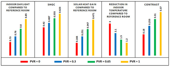 Figure 14 shows the overall assessment of the system in terms of the daylight entering the indoor environment, indoor temperature, solar heat gain, and vision contrast through the window, which are directly proportional to the PVR.