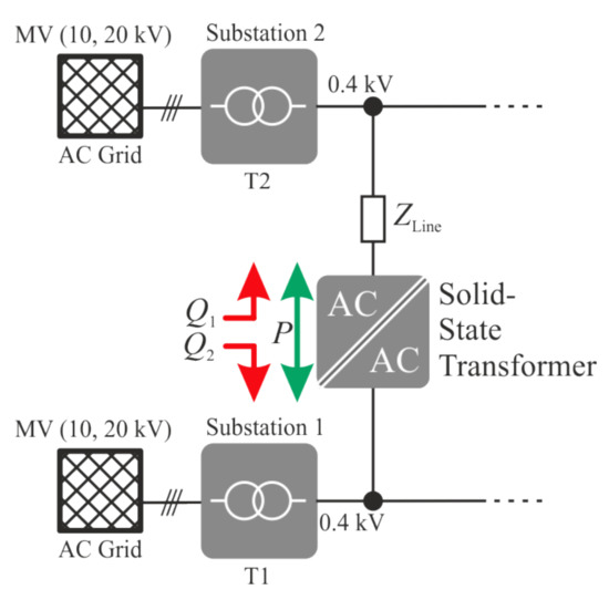 In order to meet the high peak loads caused by the charging stations, neighboring transformers or LV grids can be meshed to supply the peak power. Conventional meshing, in the form of, e.g., doubly fed grid segments, can only be realized by the costly modification of the protection equipment in the existing grid. The possibility of coupling by a solid-state transformer, which does not contribute to the short-circuit power of the grid, is presented in this work. In literature, the concept of solid-state transformers is well known, and it is mostly considered as a replacement of conventional transformers with one port acting in the grid-forming mode. A number of significant advantages have already been identified such as the fully controllable bidirectional power flow [15], reactive power compensation [15] and ensuring continued operation in case of asymmetrical faults in the grid [16]. In addition, most topologies make one or multiple DC-links available, which can be used to efficiently integrate storage systems, renewables such as PV [17] or fast-charging stations [18]. Furthermore, SSTs require a smaller footprint, less material and are lighter compared to conventional transformers, which is a big advantage in urban environments where space and weight restrictions are critical. The relatively high cost of power electronics and the complexity of connecting medium-voltage (MV) grids in conjunction with the availability of suitable medium-frequency transformers are currently a hindrance in the way of widespread use. However, economies of scale of modular concepts are expected to lead to a considerable reduction in price. Likewise, the increasing material prices of copper and steel—the main components of a line-frequency transformer—make the SST competitive in the near future.