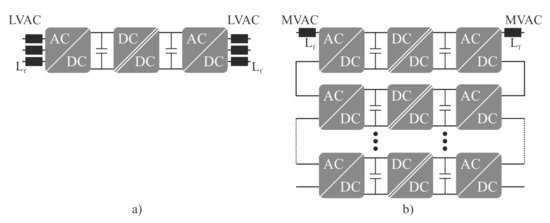 During the early stages of research in power electronics, SST concepts were presented in the literature. To date, numerous topologies have been presented, the most noteworthy of which are reviewed and classified in the following. The different SST topologies are categorized by the number of conversion stages, DC-link availability and galvanic isolation and can be found in [18,19,20]. The LV stage can be realized as a two-level topology, in single or parallel connection depending on the required output power. At the MV stage—due to limited blocking capability of the power electronic switches—multilevel-inverter topologies are a suitable solution, although they add complexity. Multi-level multi-cell inverter topologies [21], however, offer a great cost-reduction potential as LV power-electronics switches can be used. Furthermore, the isolation stage can be directly integrated into so-called power electronics building blocks [22]. The use of medium-frequency transformers within the galvanic isolated DC–DC converters offers an enormous potential in terms of material and size reduction, leading to very compact designs with a low footprint and high efficiency [18]. If an isolation stage is needed or not depends also on the grounding and protection concept of the different grids to be connected [23]. However, adding an isolation stage within the SST facilitates the grid integration, as the necessary grounding and protection of each port can be individually aligned with the needs of the connected grids. Furthermore, in the case of grid faults (e.g., single line-to-ground fault), a galvanic isolated SST is superior to a non-isolated variant, since the fault occurring is limited to the faulty port and does not affect the healthy port [23].