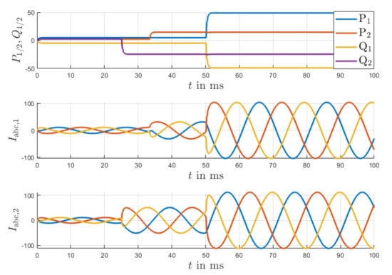The calculated results obtained with Equations (3) and (4) are shown in Figure 4. It is evident, that a smooth output characteristic is achieved and that the active and reactive power set-points are almost instantaneously reached.