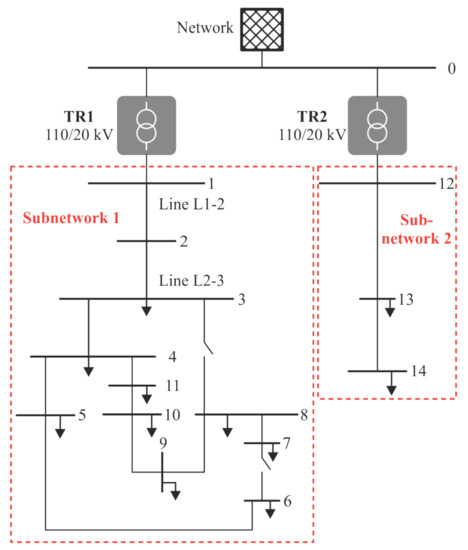 The MV benchmark distribution grid simulated is a modified version of the CIGRE MV benchmark distribution grid [36]. This network is fed by a transmission network via 2 110/20 kV transformers with a rated power of 25 MVA and is shown in Figure 5. We assume that the DC link connected between the nodes 8 and 14 in the original benchmark is open and the network therefore operates radially.