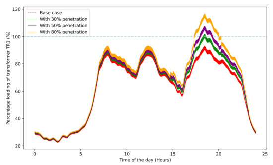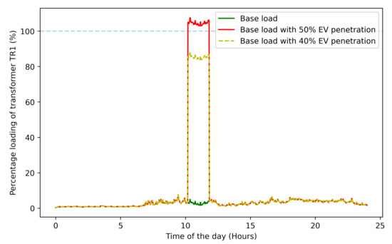 Percentage loading of transformer TR1 for different levels of EV penetration.