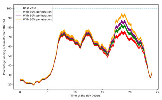 Percentage loading of transformer TR2 for different levels of EV penetration.